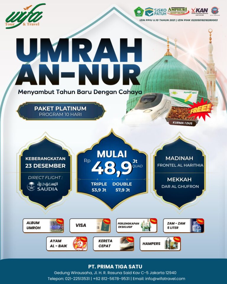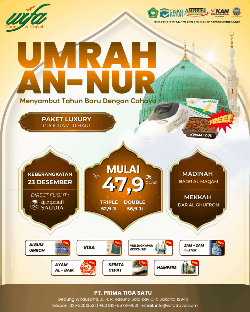 aket umroh VIP juga sering kali mencakup fasilitas tambahan seperti makanan khas yang lebih bervariasi, layanan kamar 24 jam, dan jadwal yang lebih fleksibel, memberikan kesempatan bagi jamaah untuk menjalankan ibadah dengan lebih khusyuk dan tenang. Dengan segala kenyamanan yang ditawarkan, umroh VIP memberikan pengalaman ibadah yang lebih istimewa meskipun dengan biaya yang lebih tinggi dibandingkan dengan paket umroh reguler.
