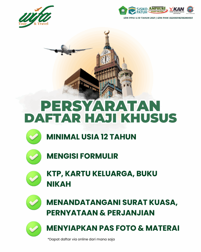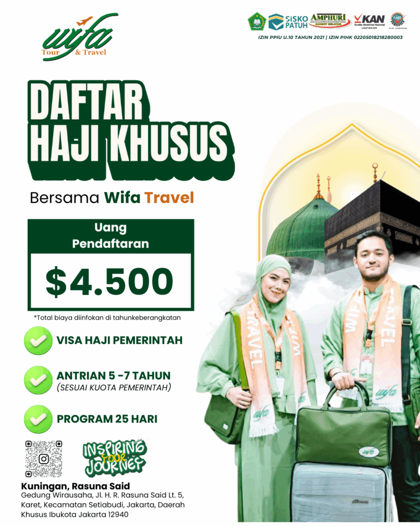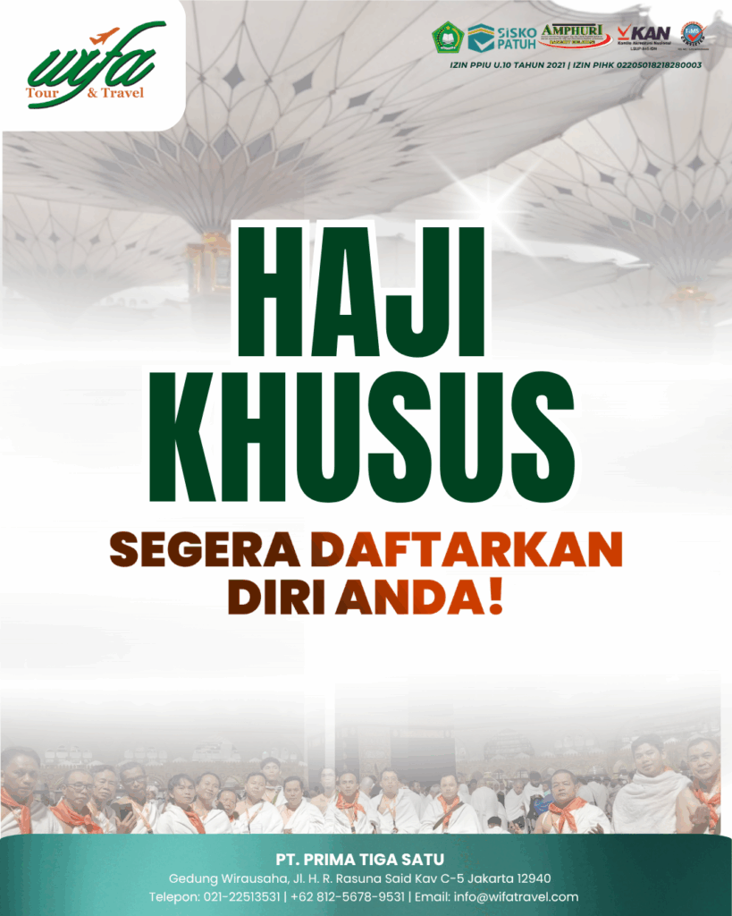 Haji khusus diselenggarakan oleh PPIU (Penyelenggara Perjalanan Ibadah Umrah dan Haji Khusus) yang memiliki izin resmi dari Kemenag. Proses pendaftarannya dilakukan melalui travel haji resmi, bukan langsung ke Kemenag. Biaya lebih tinggi dibanding reguler, tapi jamaah mendapatkan fasilitas premium seperti hotel bintang lima yang dekat dengan Masjidil Haram/Nabawi, makanan lebih variatif, serta bimbingan intensif dengan pembimbing khusus. Antrian haji khusus biasanya lebih singkat, berkisar antara 5–8 tahun, tergantung kuota. Jamaah berangkat setelah kuotanya dibuka setiap musim haji.